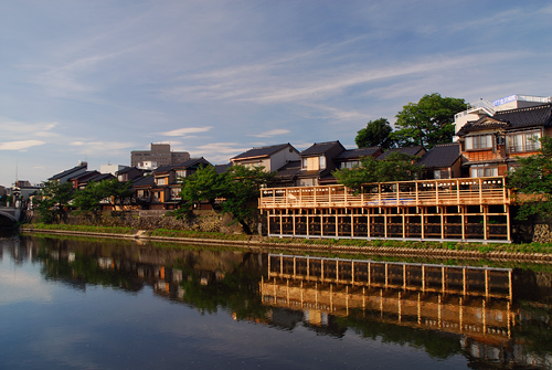 日中は入道雲が浮かぶ夏空でしたが朝は爽やかな空が広がり秋近しを感じました。今年は浅野川の川縁に真新しい川床が出来て夏の風物詩となっています。浅野川ゆかりの文豪「泉鏡花」の作品にちなんで「白糸川床」と名付けられており、夕涼みをしながら芸妓さんのもてなしで加賀料理を味えるそうです。