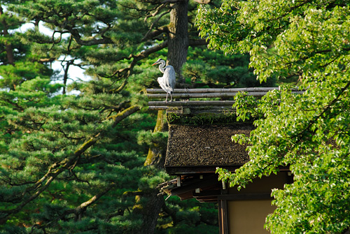 内橋亭の屋根の上にアオサギが長く立っていました。普段早朝散歩する人はお馴染みさんがほとんどですが夏休みに入って見慣れない人が多くいる光景を不思議な様子で見物しているようでした。