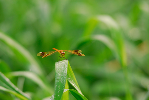 肌寒く秋の訪れを感じさせるような朝となりました。草むらは朝露にびっしりと濡れその中をミヤマアカネが沢山留まっていました。秋が近づくにつれ雄の体が赤く色づいてくる赤とんぼです。
