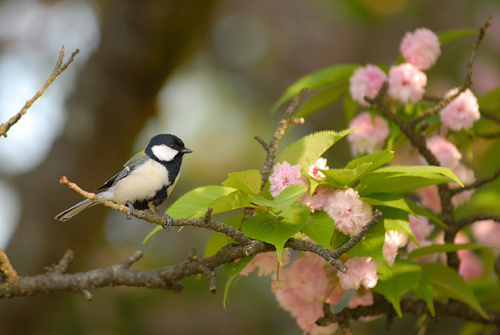 満開になった兼六園菊桜にオオルリが飛んできました。旅の途中でわざわざこの名花を見に来たのかと思わせるようにその周りを2羽の雄が飛び交っていました。月初めの早朝にこの珍しい青い鳥を見つけ私もいい気分になりました。また、シジュウカラも花の中にいました。