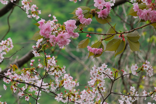 湯涌から富山との県境を過ぎるとすぐに刀利ダムがあります。ここにはまだ残雪もあり桜が咲いていました。山間の春はようやく訪れたようで何もかもが一斉に目覚め新緑の中ソメイヨシノと八重桜の競演となっていました。