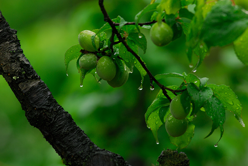 新緑の頃に降る雨を緑雨というそうです。春から葉が茂る速さには驚くばかりでもう新緑という言葉が当てはまらないくらいに緑が豊かになりました。この時期の雨は緑をより美しくしてくれます。梅林の梅が瑞々しくたわわに実り始めていました。