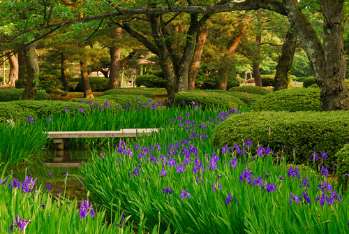 カキツバタが咲き揃い見頃となってきました。青紫の花と緑の葉は爽やかさをもたらしてくれます。またこの上品な色合いは名園にふさわしい彩りとなっています。兼六園がより美しい季節となりました。