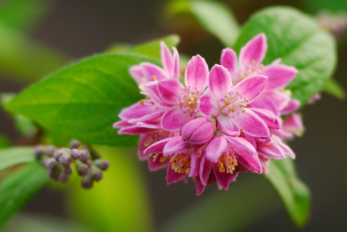 梅林の片隅に鮮やかなピンクの花が咲いていました。空木のようですがちょっと見たことがないので調べてみると園芸種の「アカハナウツギ(紅花梅花ウツギ・マギシェン)」でした。よく見るととても品よく可憐な花で心惹かれるものがありました。